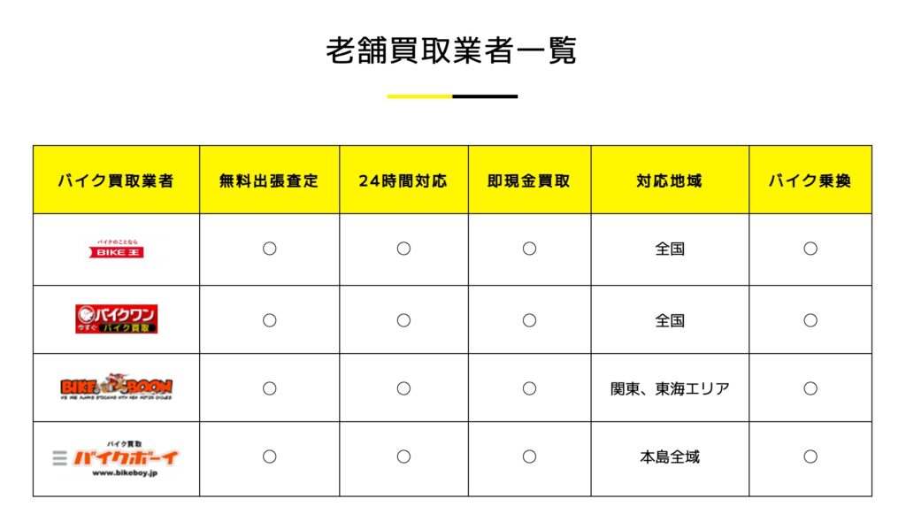 提携先は「バイクボーイ」や「バイクブーン」といった実績のある老舗業者が中心で、事故車や不動車の相談も可能。